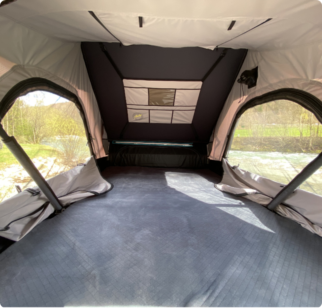 With the intelligent scissor-lift bed mechanism in your Gordigear roof tent, you can use the interior space efficiently and benefit from a more spacious feeling . You can sleep comfortably in both directions - a great advantage on uneven terrain. In addition, the mechanism provides more space and maximum flexibility in the tent.