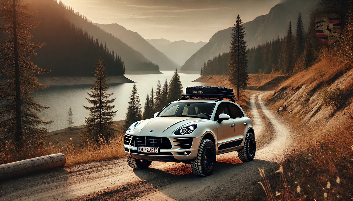 Porsche Macan mit Dachzelt fährt auf einem Forstweg am Fluss (KI)