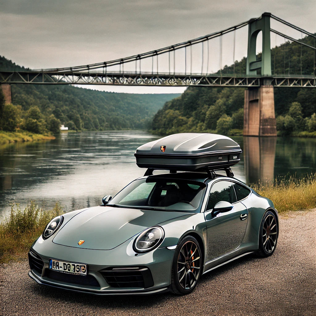 Porsche 911 mit Dachbox am Fluss und Brücke im Hintergrund (KI)