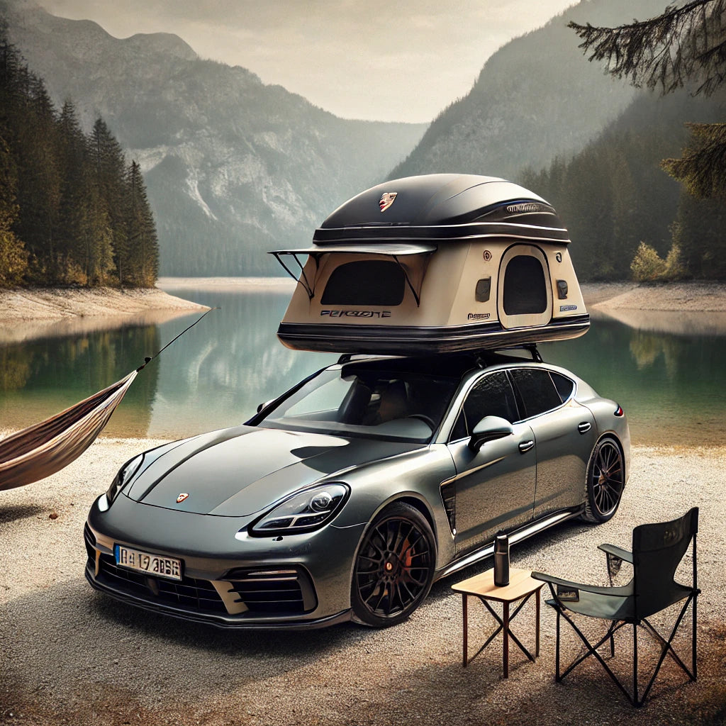 Porsche Panamera mit Dachzelt am See (KI erstellt)