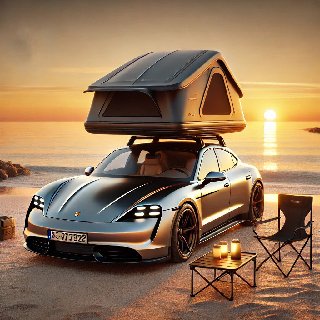 Porsche Taycan mit Dachzelt am Sandstrand bei Sonnenuntergang (KI)