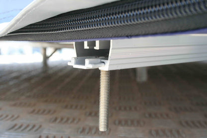 The sliding plates are slid into the aluminum mounting profiles. The tent can then be screwed to the roof rack using the mounting plates .