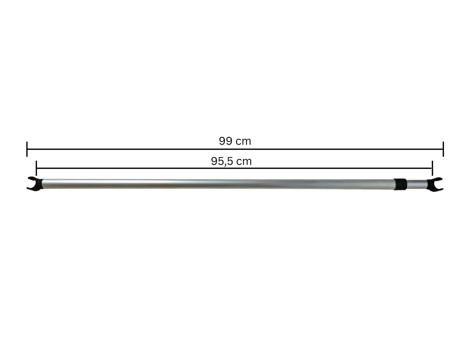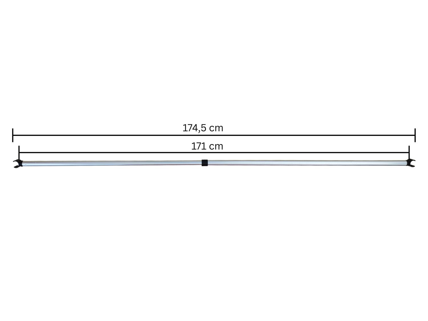 The tension rod is 99 cm long and can be extended to approximately 174.5 cm. The screw clamp allows the rod to be locked in place.