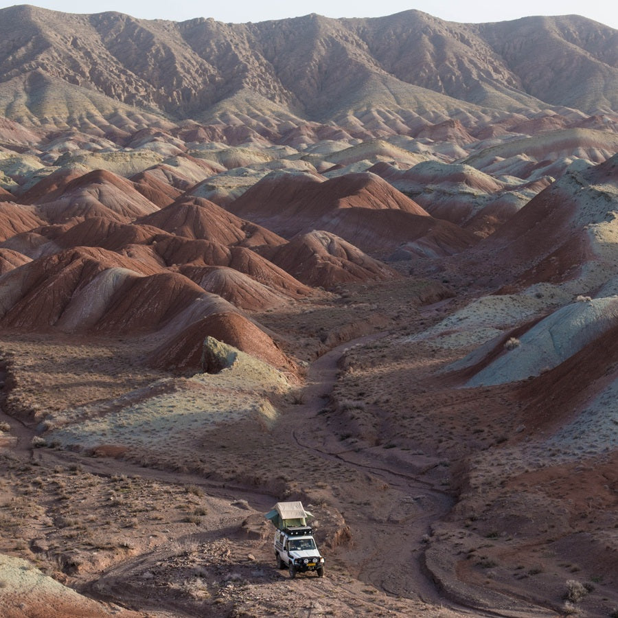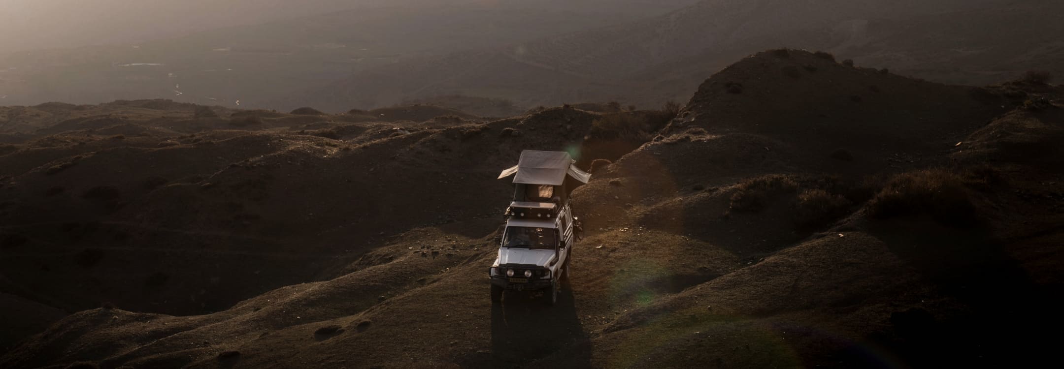 Irans Berg- und Hügellandschaft und mittendrin ein Geländewagen mit Dachzelt allein auf weiter Flur