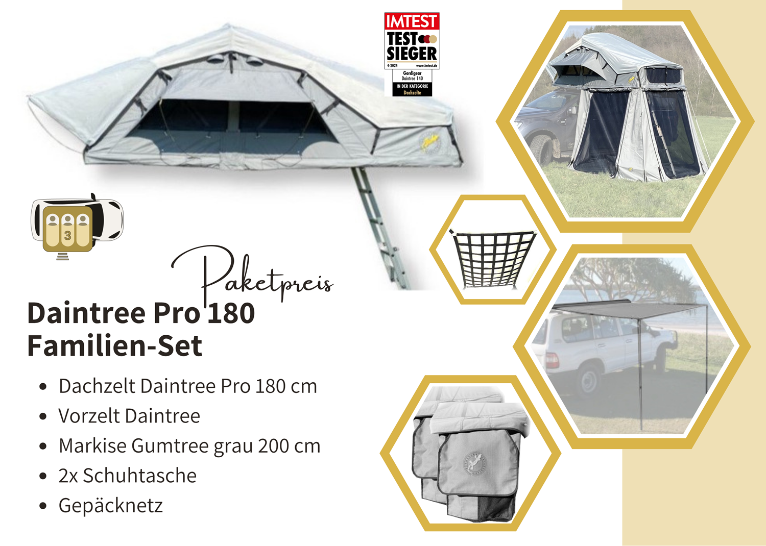 Lieferumfang: Dachzelt Daintree Pro 180 cm, Vorzelt, Markise grau 200 cm, 2x Schuhtaschen und Gepäcknetz