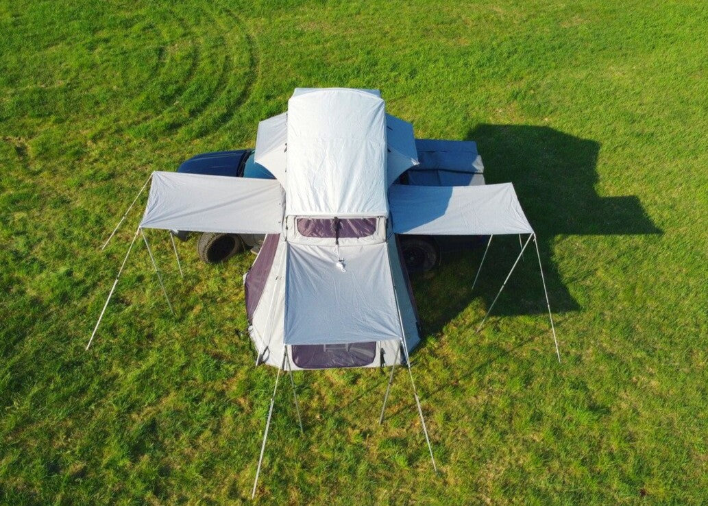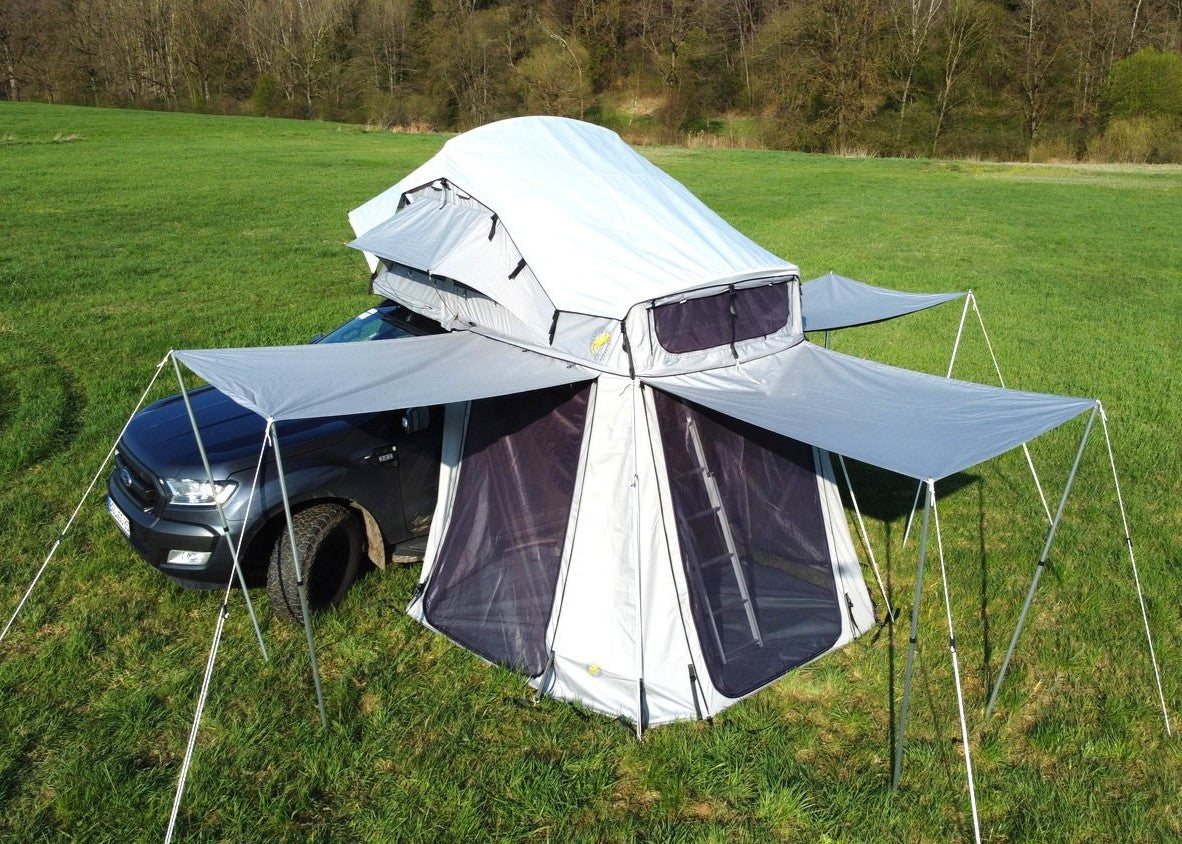 Aber das Daintree-Vorzelt kann so viel mehr. Riesige Öffnungen an allen drei Seiten können als Türen benutzt oder vollständig verschlossen werden, sodass das Zelt aus jeder Richtung begehbar ist. Eine sehr praktische Funktion, wenn Sie eine Fahrzeug-Markise mit Ihrem Dachzelt-Setup verwenden. Die Türen lassen sich auch als Markisen aufstellen (zwei Stangen sind im Lieferumfang enthalten) und bieten zusätzlichen Schatten an sonnigen Tagen. Ein geniales Design macht das Vorzelt höhenverstellbar (zwischen 185 cm und 205 cm). Für noch höhere Installationshöhen sind Erweiterungen verfügbar. Das Panorama-Fenster im überdachten Eingangsbereich des Hauptzeltes ist so gestaltet, dass heiße Luft abgeführt wird, wodurch der Vorzeltbereich nun auch als Ort zum Kochen verwendet werden kann, ohne dass Dämpfe in den Schlafraum eintreten. Wie all unsere Produkte ist auch das Daintree-Vorzelt in wenigen Minuten einsatzbereit und, wenn es nicht verwendet wird, lässt es sich auf Rucksackgröße zusammenlegen. Es sind zwei Teleskopstangen zum Aufspannen der Öffnung im Lieferumfang enthalten. Weitere Teleskopstangen können zugekauft werden.