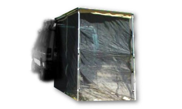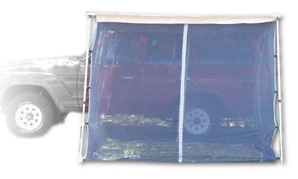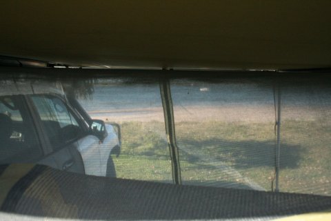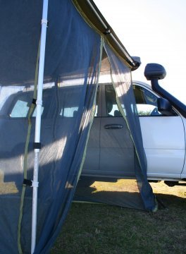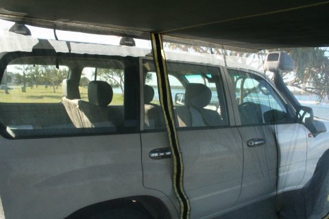 Das feinmaschige Moskitonetz deckt alle vier Seiten und das Dach ab, so daß vollständiger Schutz gewährleistet ist. Durch einen Eingang in der Rückwand kann man das Fahrzeuginnere erreichen, ohne den geschützen Bereich verlassen zu müssen.
