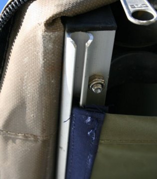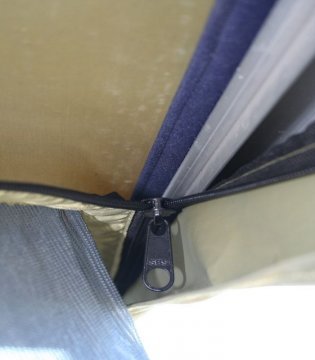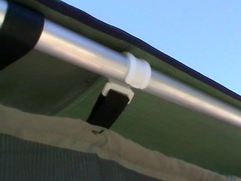 Aufnahme in der Kehderschiene vor dem Aufklappen des Dachzelt, stabile Reißverschlüsse. Einzig sollte man stabilere Heringe, z.B. für geschotterten Untergrund, nachkaufen.