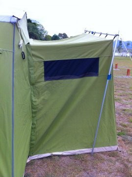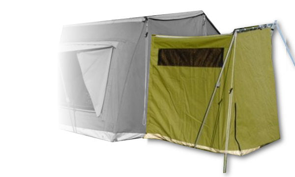 Der kleinste unserer optionalen Räume kann einen großen Unterschied machen. Der Duschraum wird am Hintereingang des Zeltes befestigt und kann eine Campdusche und -toilette behausen. Das Dach ist an seiner höchsten Stelle 195 cm und abgeschrägt, so daß Regenwasser jederzeit abrinnen kann. Der Boden ist fest integriert und lässt sich auf einer Seite via Reißverschluss öffnen, was den Ablauf des Duschwassers ermöglicht. Genau wie die Eingangstür sind auch beide Fenster mit Moskitonetzen versehen und können vollständig verschlossen werden.