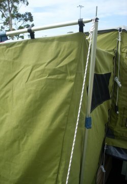 Aufnahme in der Kehderschiene vor dem Aufklappen des Dachzelt, stabile Reißverschlüsse. Einzig sollte man stabilere Heringe, z.B. für geschotterten Untergrund, nachkaufen.